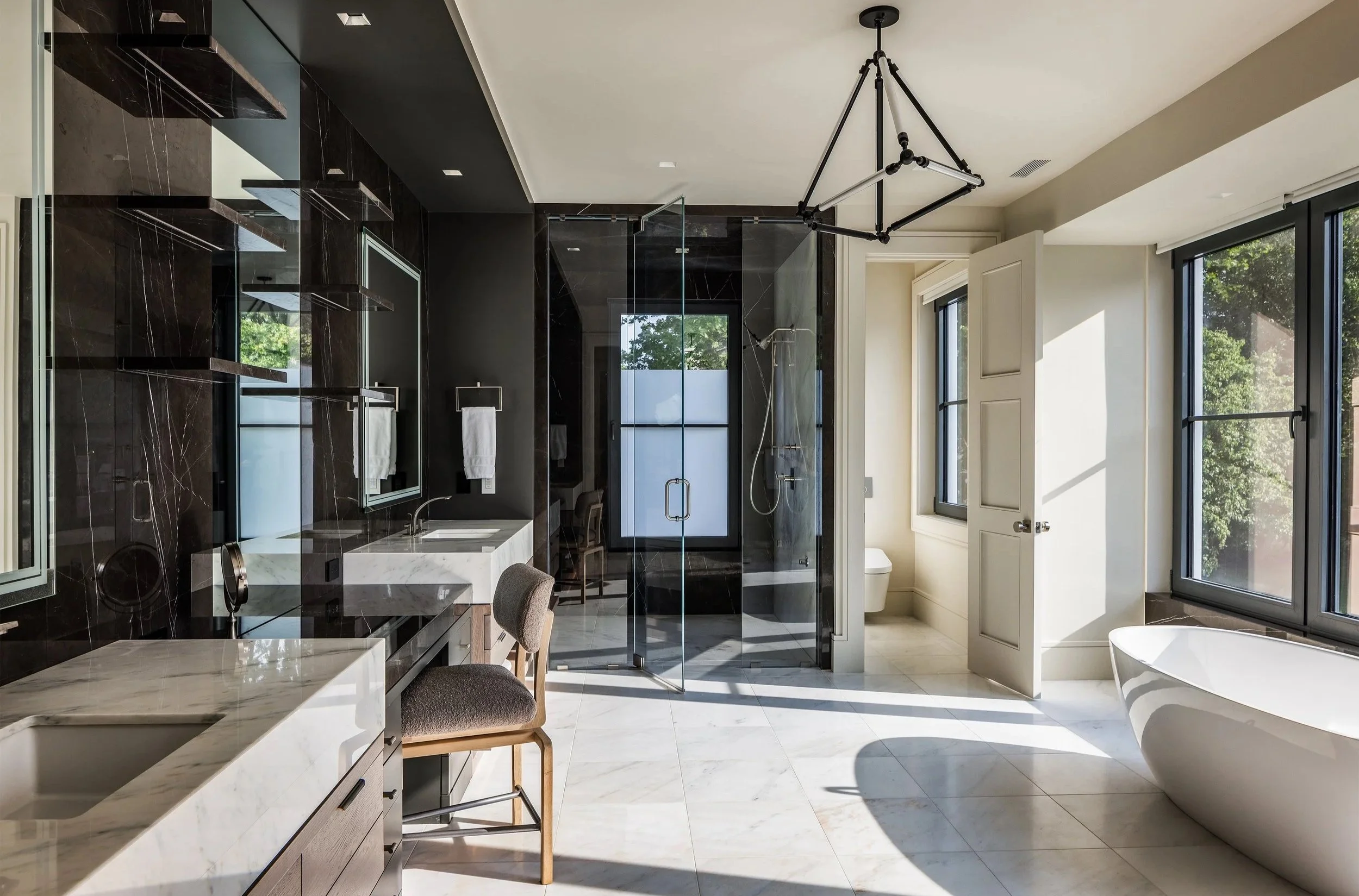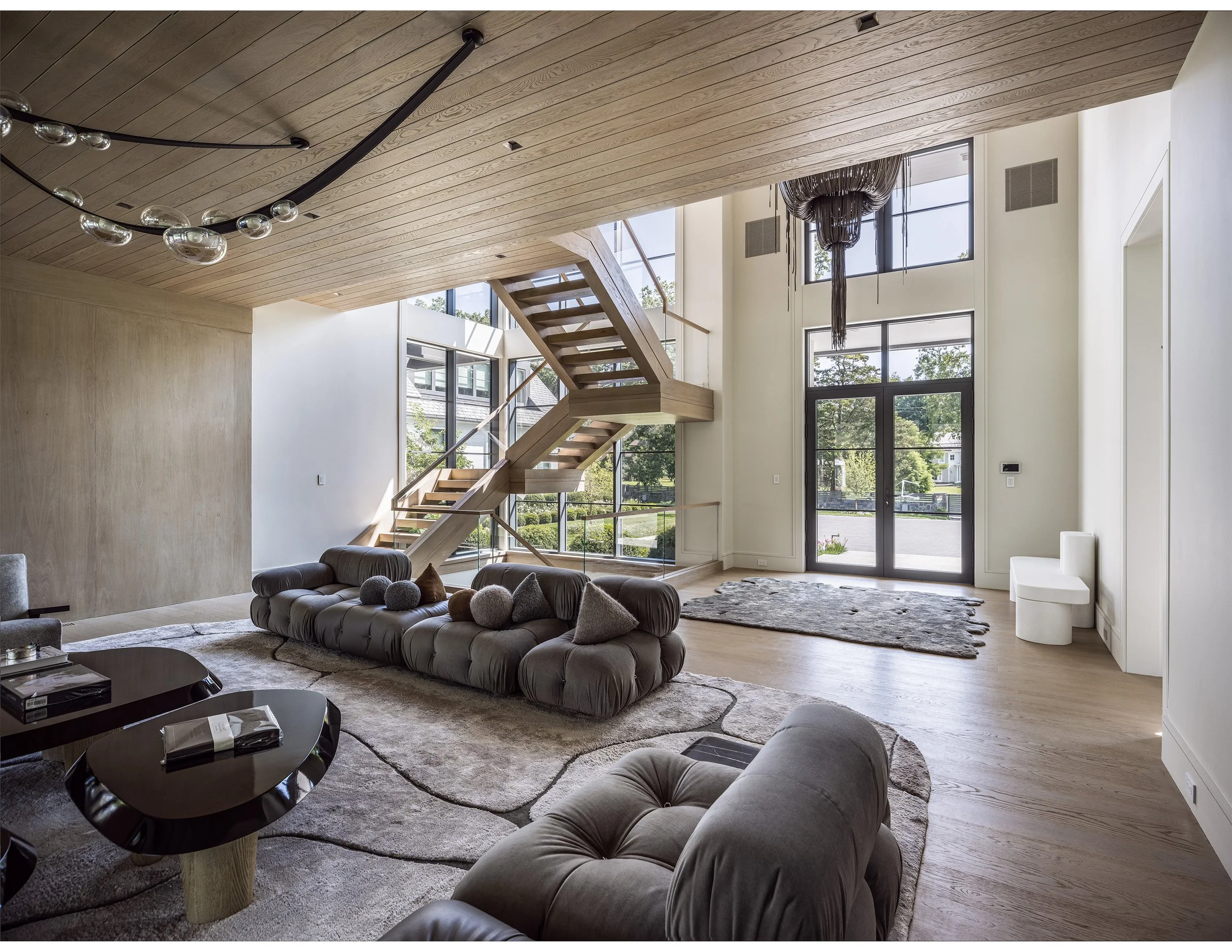 This Westport home blends modern design with cozy, livable comfort. We kept the palette neutral with lots of texture, plush seating, layered rugs, and natural wood throughout. The floating staircase and double-height windows bring in tons of light and make the space feel open and airy, while soft finishes keep it warm and inviting.