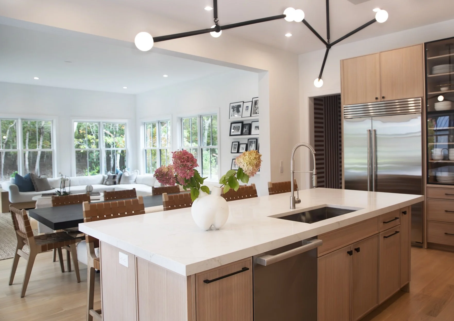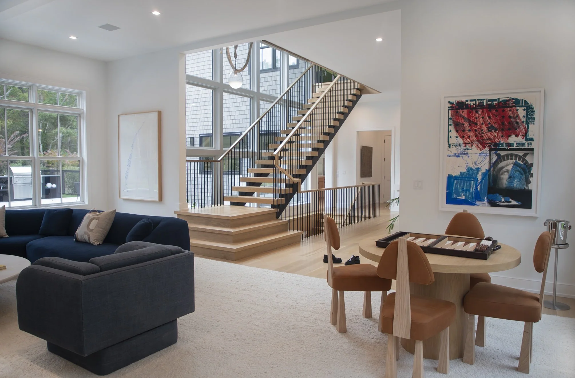 This modern residence embraces natural warmth through the use of rich wood finishes that flow seamlessly throughout the interiors. The kitchen, entirely wrapped in wood, becomes the heart of the home, grounding the space with organic texture and elegance. Complementary tones and subtle color accents add depth without overshadowing the natural materials. A striking light fixture above the staircase serves as a sculptural centerpiece, tying the design together with a sense of contemporary refinement.